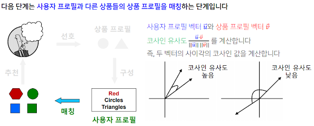사용자 프로필과 작품 프로필을 one-hot vector를 이용하여 표시한다. 그럼 작품마다 더해서 평균으로 표시할 수 있는 등의 작업을 할 수 있다. 그래서 사용자 프로필과 작품 프로필간의 유사도를 코사인 각도로 계산 한 후, 최종적으로 추천한다.