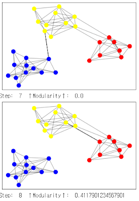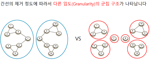 이런식으로 매개 중심성이 가장 많은 간선부터 하나씩 제거하며 군집성을 측정해 제일 높은걸 기준으로 삼는듯.