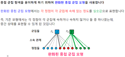다만 이렇게 하면 단점이, 연결이 된다 안된다 로 이분법적으로 모형을 정의하는 거라 기존에 있던 경사하강법 등을 못 쓰게 된다. 그래서 가중치를 부여하는 완화된 중첩 군집 모형을 사용한다.