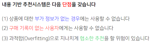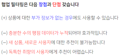 비슷한 취향의 사람으로 추천하기 때문에 당연히 그에 따른 장단점이 존재한다.