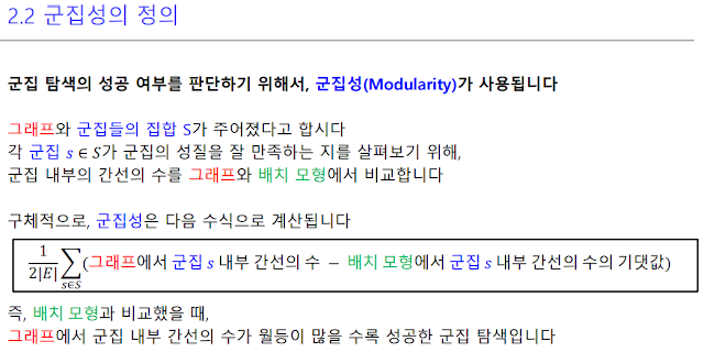 그렇게 원본 그래프에서 군집 s 내부 간선의 수에 바꾼 거를 빼서 어떻게 점수를 만들어 내는 모양이다. 이 군집성 정의 식에서 식을 통해 나온 결과가 크다는 것은 그래프에서 군집 s 내부 간선의 수가 많다는 걸 뜻하기 때문에 성공한 군집 탐색이라고 한다.