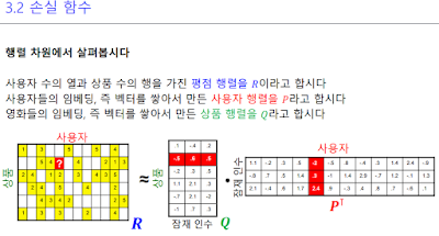 이게 무슨 말이냐면 행을 유저로 놓고 열을 영화로 놓은 원래 참 데이터가 있을 텐데 이 행렬은 유저와 그 유저에 대한 잠재벡터, 영화와 그 영화에 대한 잠재벡터의 행렬 곱으로 나눠서 볼 수 있다. 결국 이 유저행렬, 영화행렬을 다 채우면, 자연스럽게 원래 있던 참 데이터의 예측값이 나올 수 있게 되는 것이다. 그리고 참 데이터와 이렇게 예측해서 만든 행렬이 있으니 학습이 가능해서 학습하는 것이다.
