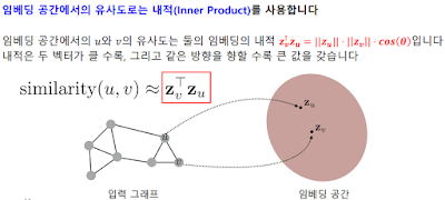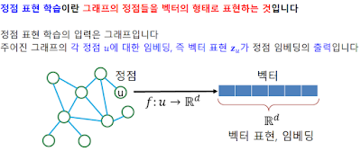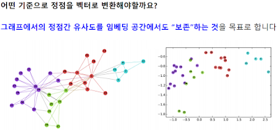 이전까지는 그래프 라이브러리를 활용해서 그래프 자체를 입력값으로 넣어 학습시켰지만, 원래 벡터 형태를 가정하고 만든 모델들이 있으니까, 그래프 즉 그래프의 정점들을 벡터형태로 임베딩하면 벡터 형태의 데이터로 다른 여러 훌륭한 모델들을 사용할 수 있다.