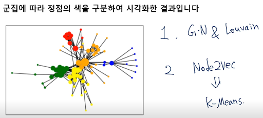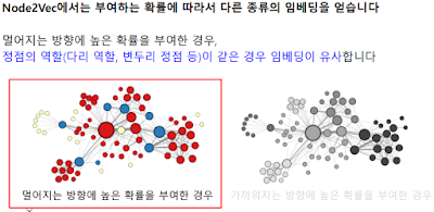 위 그림이 Node2Vec으로 임베딩을 한 뒤에 K-means로 군집 분석을 수행한 건데, 부여하는 확률에 따라 다른 기능으로 작동하는 걸 볼 수 있다.