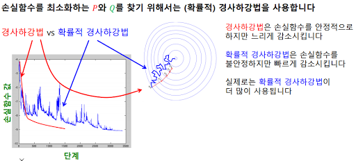 (확률적) 경사하강법을 통해 손실 함수를 최소화하는 잠재 인수와 편향을 찾아냅니다