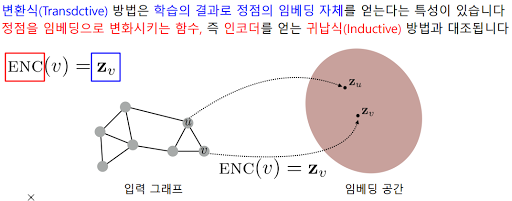 지금까지 위에서 한건 변환식(Transductive) 방법. 이게 뭐냐면 학습의 결과로 정점의 임베디 자체를 내놓기 때문에 생기는 한계들이 있다.