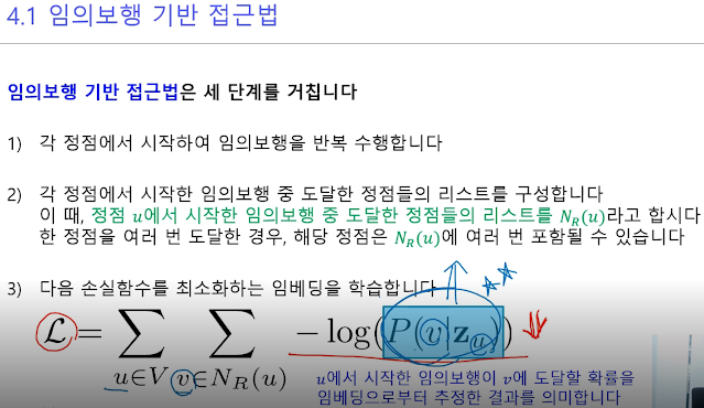 DeepWalk는 위에서 한 기본적인 임의보행 방법이고, 즉 현재 정점의 이웃 중 하나를 균일한 확률로 선택하는 이동과정을 반복하는 거고
