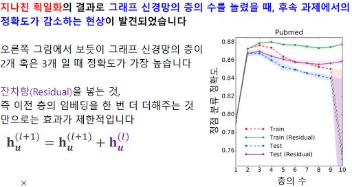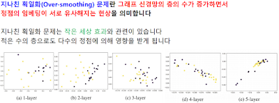 레이어 크기를 늘릴수록 다른것들끼리 유사하다고 판단해서 구별이 안된다. 이게 무슨 말이냐면 레이어를 늘리면 간선이 저 멀리까지 가서 해당 정점이 아주 멀리있는 다른 정점들까지 고려해서 파악이 되다보니 서로 다른게 아니라고 학습이 되는거. 그래서 레이어가 커질수록 서로 관련이 깊어지고, 그러다보니 임베딩이 비슷해진다.