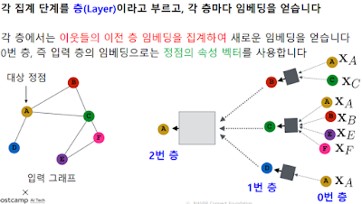 그럼 각 정점들을 임베딩 했으니 각 층에 넣어서 학습할 수 있다. 이웃들을 다같이 입력값으로 넣어 계산하는 방식이라 구하고자 하는 대상 정점에 따라 구조가 달라질 수 있다.