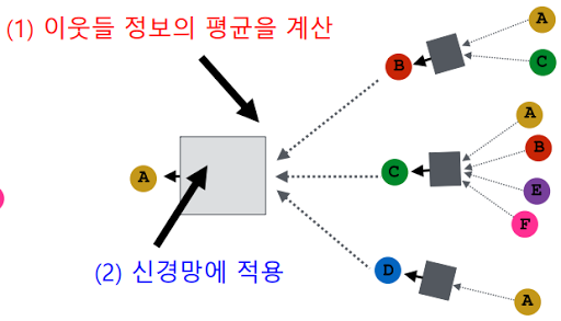 그럼 입력값이 매번 달라지는데 어떻게 입력을 하냐? 그래서 이웃 정보들의 평균을 계산하고 신경망에 넣는다.