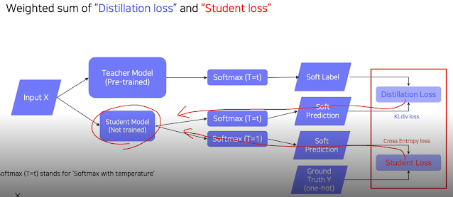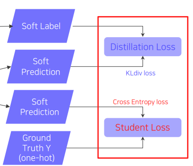 Distillation Loss의 목적은 teacher의 network를 따라하여 비슷하게 하는 것. KLdiv(Soft label, Soft prediction)