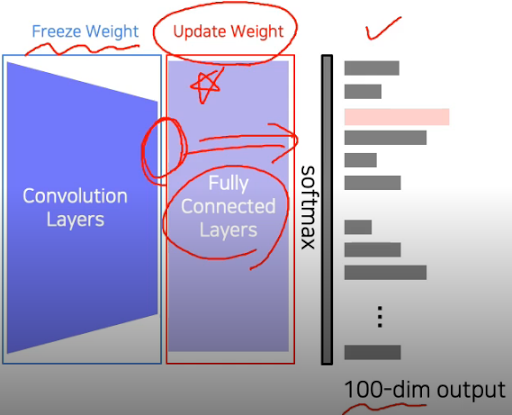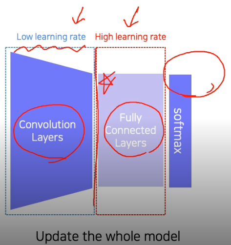앞의 통상적인 개념이 들어가있는 CNN 부분은 작은 learning rate로, Fully connected layer는 큰 learning rate로 학습한다. 그래서 전체적인 개념은 작게 수정하면서 원하는 목적의 모델에 맞게 빠르게 변형된다고 한다. 1번과 다르게 큰 작업에서 사용된다고 함.