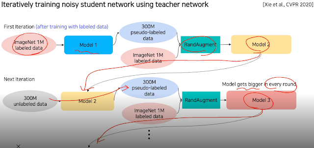 원래 여기서도 Teacher는 크고 Student는 작은 모델을 썼으나 그 반대로 Teacher model은 작은거, Student를 큰걸로 쓰는게 성능이 좋다는 결과가 나왔나 보다. 이렇게 pseudo-labeled data에 RandAugment까지 써서 학습하고 이렇게 새로 나온걸 teacher로 해서 다시하고... 하는걸 반복하다 보면 성능이 정말 좋더라.