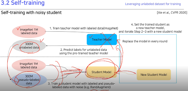 사람이 아무리 많은 label을 정의했더라도 그거보다 더 많은 unlabel이 더 많을 수밖에 없다. 그래서 pre-trained model로 unlabeled data까지 임의의 pseudo-labeled data로 만들어서 다음 model엔 이 data들도 넣어 학습하는 것 같다.