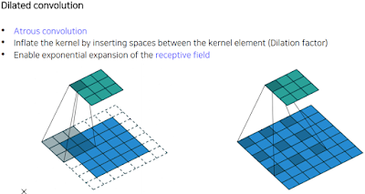 중요한 component는 Dilated convolution. 왼쪽처럼 한칸씩만 하는게 아니라 1픽셀을 띄워서 저장함. 단순하지만 이렇게 하면 receptive filed를 늘릴 수 있다.