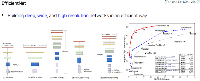 (a)는 기본. (b)는 GoogLeNet에서 햇던것처럼 옆으로 확장하기, (c)는 그냥 더 깊은 layer, (d)는 입력으로 받는 이미지를 크게. 이렇게 다양한 거를 적절하게 활용하면 어떨까 한게 (e). 근데 설명 들어보면 컴퓨터가 알아서 모델을 구현하게 만들었다고 한다. 어떻게 하는건지 찾아봐야 할듯.