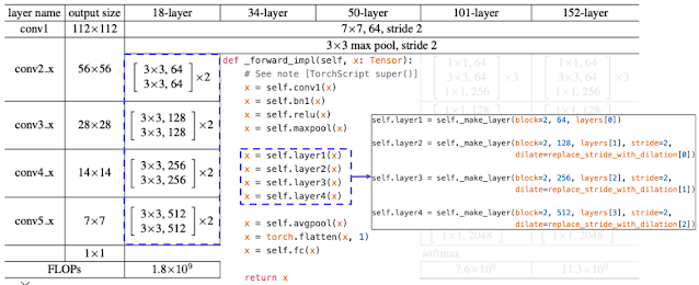 그래서 실제로 구조를 보면 처음에만 전과 비슷하다가 위에처럼 수평으로 쌓은 레이어들이 반복되서 나타나는걸 볼 수 있다. 거기다 또 vanishing gradient 생기지 말라고 중간중간에 측정 결과값들을 다시한번 넣고있음.