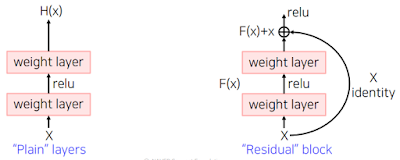 이것은 아마 레이어가 너무 깊어서 원래 입력값이 출력값으로 나가면서 많은 정보가 사라지는 것이라고 추정하고 그럼 마지막에 지름길로 입력값을 다시 넣어주자. 라고 생각해서 그렇게 만들었다. 이걸 Residual block 이라고 함.