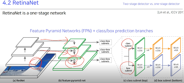 또다른 one-stage detector로는 RetinaNet이 있는데 전날에 했던 U-Net과 비슷함. 똑같이 대칭으로 만들어서 정보를 줌. 이렇게 하니까 정확도, 속도 모두 향상되더라.