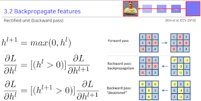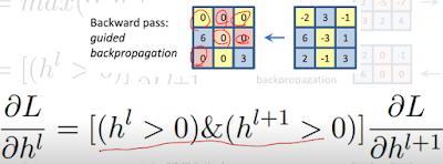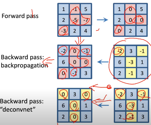 Forward pass 할 때 relu를 사용하는데 음수는 0으로 없애는 방법이다. 이걸 거꾸로 돌릴 때 backpropagation 관점에서 보면 gradient해서 0으로 나온 값을 0으로 바꾸고 완전히 되돌리는 deconvnet 관점에서 보면 결과에서 나온 값을 0으로 바꾼다.