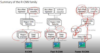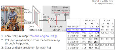 Fast-RCNN은 CNN으로 뽑아놓은 feature를 그대로 활용해서 구분할 수 있도록 만들고, 물체 위치(bbox) 찾는것도 regression으로 학습가능하도록 만들어 학습시키는 것 같다. 그래서 더 빨리 나왔다.