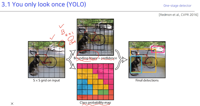 one-stage와 two-stage의 차이점. two-stage는 물체 위치 찾아내고 그 위치 box에 대해서만 classification을 쓰는데 이렇게 2단계로 나누니까 성능이 떨어진다. 그냥 일정한 위치에 대해서 다 수행해서 한번에 하자는게 one-stage